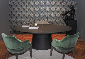 O “Espaço Corporativo” dos arquitetos Cláudia Horta e Edson Velo foi feito para inspirar reuniões. Com um ar acolhedor e muita elegância, os profissionais trouxeram para o conceito do ambiente um papel de parede da renomada Wallcovering que destaca o espaço e traz elementos decorativos para a parede.