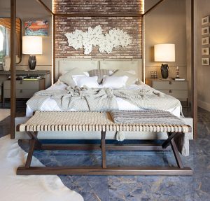 No “Quarto Campestre” das arquitetas Olga Bergamini e Karin Neitzke o destaque são os elementos da arquitetura de Toscana, na Itália. E para compor o décor e a ideia da criação, as profissionais escolheram o papel de parede da JVN em tijolos para representar o estilo do décor e elementos da Itália, além de ainda explorar o sentido do tato e da visão.
