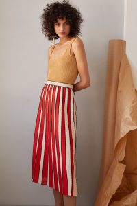 O equilíbrio de leveza e substância dá o tom das tramas desta coleção. A tela com efeito transparente é muito presente, principalmente nos listrados, em que transparência dá vida às diferentes espessuras das listras. O jacquard telado traz uma textura consistente, que ganha forma em saias mídi, regatas e vestidos. As nervuras e canelados chegam listradas, formando estampas ou monocromáticas. As silhuetas são atemporais e descomplicadas, e trazem leveza com transpasses e assimetrias feitos em moulage. E a leveza também está no material que é destaque nesta temporada: o fio de linho, fibra natural ideal para as temperaturas mais quentes.