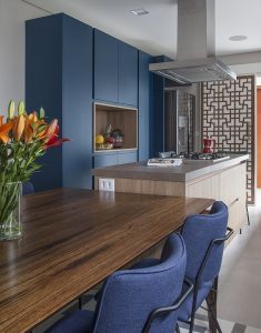 Na cozinha integrada com a sala de jantar, a arquiteta Pati Cillo elegeu o azul para as cadeiras e a marcenaria dos armários executados pela SCA Jardim Europa. Na medida certa, o tom promoveu vivacidade e descontração para o dia a dia dos moradores | Foto: Luis Gomes