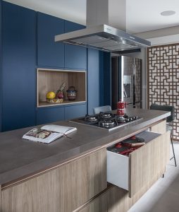 Aconchego, harmonia e bem-estar são alguns dos atributos almejados pelos moradores e os profissionais à frente de seus projetos. Segundo a diretora da SCA Jardim Europa, não existe uma regra que determina a proporção, mas o olhar meticuloso e experiente de um arquiteto ou designer consegue diagnosticar, com antecipação, um possível exagero e eleger as soluções, isto é, onde outras cores mais leves serão incorporadas para a leveza e graciosidade da cozinha. “Como arquiteta de formação, afirmo que pode nascer do desejo do cliente ou da percepção que o profissional consegue captar da sua personalidade. O próximo passo é estabelecer onde ela estará presente e a marcenaria costuma ser a mais especial por conta do seu protagonismo”, discorre Karina. Além disso, se for possível testar as combinações de cores antes de inseri-las completamente no ambiente, pode evitar arrependimentos no futuro. “In loco tudo é diferente”, acrescenta.