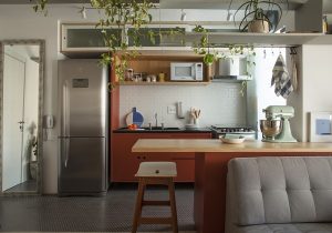Na cozinha integrada, o escritório de arquitetura COA utilizou as pastilhas hexagonais Barents M6329 no piso. O cinza do revestimento atua como base na composição com o tom coral presente na marcenaria dos armários e na bancada, além de delimitar a cozinha na conexão com a sala de estar do apartamento.
