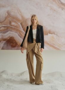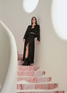 Bordados em 3D e volumes que texturizam a silhueta transformam cada peça em um estudo de movimento e percepção. A alfaiataria revisitada surge com um olhar contemporâneo, transitando entre o oversized desconstruído e o blazer cropped de proporções inovadoras. Essa abordagem redefine códigos clássicos e amplia a versatilidade da coleção, explorando novas formas de expressão através da moda.