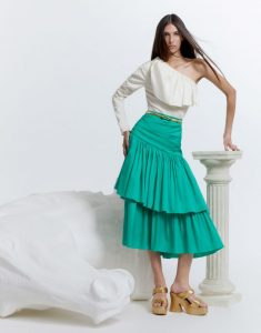 Nos acessórios, uma seleção minuciosa entra em cena com a sandália cobre, o cinto, bracelete, anel e colar pensados como artifícios extraordinários para finalização das silhuetas em tons dourados brilhantes com pedras coloridas elevadas a obras de arte.