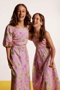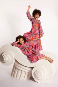 Tal mãe, tal filho, os vestidos e conjuntos diversos contemplam as grandes estrelas do lançamento. Em um teatro de estampas florais desenhadas à mão, são apresentadas nos mais distintos formatos: peças em plano de fundo escuro ou em cartela clara de cores, como no conjunto de top e saia. O nome de personagens emblemáticos da Commedia, como Pierrot e o logo homônimo do movimento, estampam as t-shirts e malhas com tom fun e descolado. Nas peças da linha adulta, rendas aparecem em tons de pink e preto, babados em organza assimétricos na altura do busto e amarrações estratégicas nos tops monocromáticos ou nos vestidos listrados.