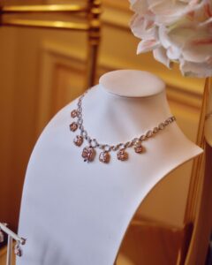 Os conjuntos Sissi, Lili e o Choker Velvet trazem consecutivamente uma combinação distinta de sofisticação e inovação. No Conjunto Sissi, morganitas suaves emolduradas por diamantes rosa criam um brilho harmonioso que evoca o romantismo clássico e o ar da realeza. O Lili, em ouro branco com uma imponente água-marinha cabochão no centro, é a personificação de elegância e atemporalidade. Por fim, o Choker Velvet surpreende com seu design inovador, que inclui um fecho aparente sem necessidade de ajuste, além da possibilidade de personalização com diferentes tiras de veludo, tornando-o uma peça versátil e única.