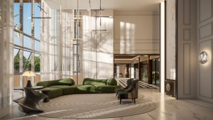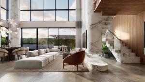 A fachada imponente e contemporânea é composta por texturas cinzas e elementos metálicos, enquanto as varandas são revestidas com madeira ecológica. O time responsável pelo projeto do empreendimento inclui profissionais renomados, como Renata Tilli, no paisagismo; Garage Plan, no planejamento das garagens; e o Studio Architetonika Nomad no projeto de interiores.