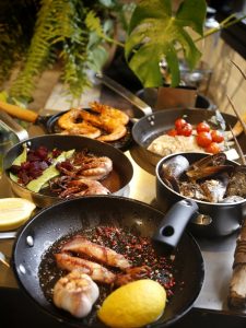 Uma das principais apostas do Fish*me será a versatilidade, descomplicando o consumo de peixes e frutos do mar frescos, fornecidos pelos principais produtores e distribuidores do mercado, na capital paranaense. Um dos grandes destaques da casa serão os preparos na parrilla, tipo de assadeira bem conhecida do churrasco argentino que valoriza o calor indireto e não defuma as peças assadas. Assim, escolhas como o Camarão Pistola com vinagrete (duas unidades a R$ 40), o Espeto misto de camarão e polvo (R$ 30) e até o Filé de atum selado com crosta de castanha e maionese de wasabi (porção de 200 gramas a R$ 45) vão ganhar muito em sabor e textura.