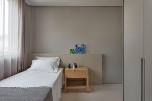 O objetivo era que o apartamento fosse leve e funcional para receber todos. Revestido quase que totalmente com material único, granilite cor areia, sua escolha se deu pela funcionalidade do material e possibilidade de trabalhar tanto no piso, como nas paredes, nichos e bancadas, proporcionando assim, uma atmosfera clean e confortável.