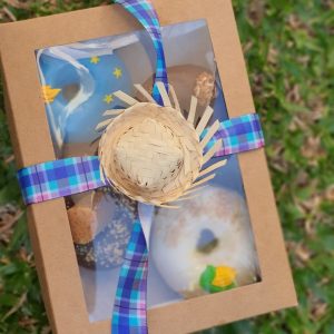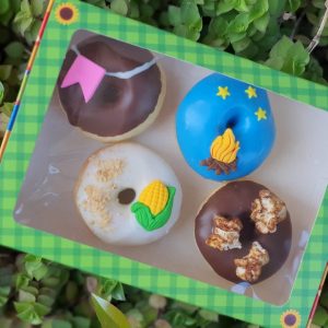 – Caixinha temática com visor com 4 mini donuts de festa junina: sprinkle de milho com amendoim, sprinkle de fogueira, sprinkle de bandeira e pipoca doce (R$ 25,00).