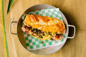 Os autores dessa delícia, Maria Clara Bensi Carnevalli e Leandro Carnevalli, preparam os pasteizinhos com costela bovina desfiada e temperada de forma artesanal, geleia de pimenta e maionese caseira especial.