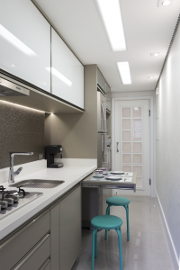 A maior mudança pode ser vista na cozinha, que ganhou móveis novos, sob medida, atendendo as necessidades dos moradores. “Por conta da profissão e seu dia a dia corrido, solicitaram que a cozinha contasse com um espaço de apoio para refeições rápidas. Por ser tratar de um layout em formato de corredor, optei por uma mesa embutida no móvel, que abre como se fosse uma gaveta. As banquetas ficam escondidas no nicho abaixo e são posicionadas em torno da mesa no momento do uso”, explica a arquiteta Ana Johns. Os revestimentos escolhidos, bem como o uso da iluminação, deram a sensação de amplitude ao ambiente, além de trazer claridade ao cômodo que conta somente com uma janela pequena. Para o piso, optou-se por um porcelanato polido, combinando com o papel de parede ao fundo. Mas o grande destaque fica para o porcelanato italiano com brilho e textura em cima da bancada.