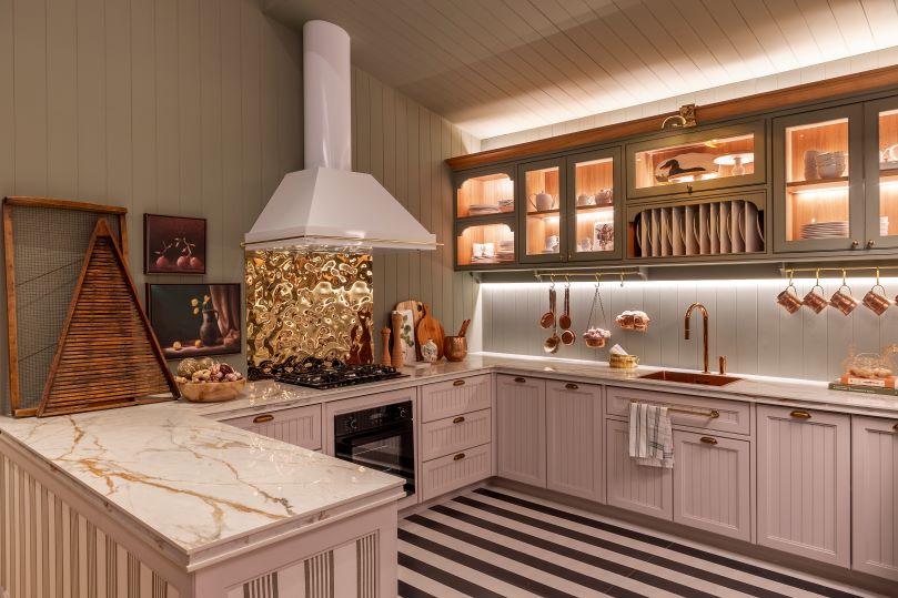 Em cada espaço da casa de 244m2, o tema “De Presente, o Agora” emerge a partir da afetividade. Objetos antigos que sugerem ser herança de família e uma grande variedade de tecidos com releituras de estampas clássicas aportam raízes, referências de infância e sensação de acolhimento. Em uma cozinha retrô, a linha de metais Deca You traz um design clean na Bica Curva e Acionamento Flat no acabamento Red Gold, junto a Cuba para Cozinha Dream em Cobre, reforçando pela tonalidade das peças, a proposta de resgate de memórias e vivências também presentes em acessórios e itens de decoração.