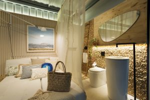 No Banheiro Deca de Érico Monteiro, o espaço surge focado na liberdade pessoal, isento de amarras sociais e, por isso, trata-se de um banheiro sem gênero. Projetado para um casal, irmãos ou para amigos, se transforma em um local confortável que, inclusive, pode ser utilizado como banheiro office.