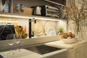 Na cozinha, destaque para o design sofisticado e funcional do Filtro de cozinha Twin Black Matte (2240.BL.MT). Com tecnologia Carbon Block, elimina impurezas e até 75% do cloro, mantendo apenas o flúor e sais minerais necessários, o que torna a água mais pura para o consumo. Além disso, conta com misturador monocomando que possibilita a escolha da temperatura quente ou fria, oferecendo mais praticidade no uso diário. A Cuba de cozinha Quadratta em Inox (CC.600.40.STD.INX) personifica uma interpretação contemporânea e minimalista, graças as suas formas retas. Já a Calha organizadora de cozinha também em Inox (AC.200.75.ORG.INX) contribui para organização das louças na bancada.