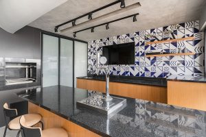 A área gourmet foi eleita o ponto de encontro para a reunião da família e dos amigos. Lá, tanto a ilha quanto os armários possuem estrutura em folha de madeira natural e tampo em granito preto São Gabriel, com acabamento polido. Por ter uma boa resistência e uma estética moderna, que se encaixa bem com o briefing do décor, ele também é encontrado na bancada da cozinha.