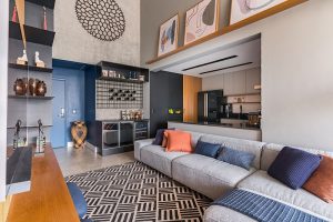 Para um apartamento de 120 m², localizado no bairro da Vila Olímpia, o objetivo da arquiteta Gabriela Prado, da GPAD, era trazer um estilo industrial, contemporâneo, mas sem deixar de lado a elegância e a sofisticação do espaço, que conta com um imponente pé-direito duplo