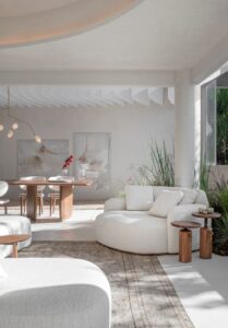 Linhas curvas e tons terrosos criam ambientes que acolhem e convidam ao relaxamento. Inspirada na natureza, essa tendência combina funcionalidade e beleza. No projeto da arquiteta Bianca Kruger, o sofá Orquestra e as poltronas Luna, traduzem essa estética com fluidez e sofisticação.