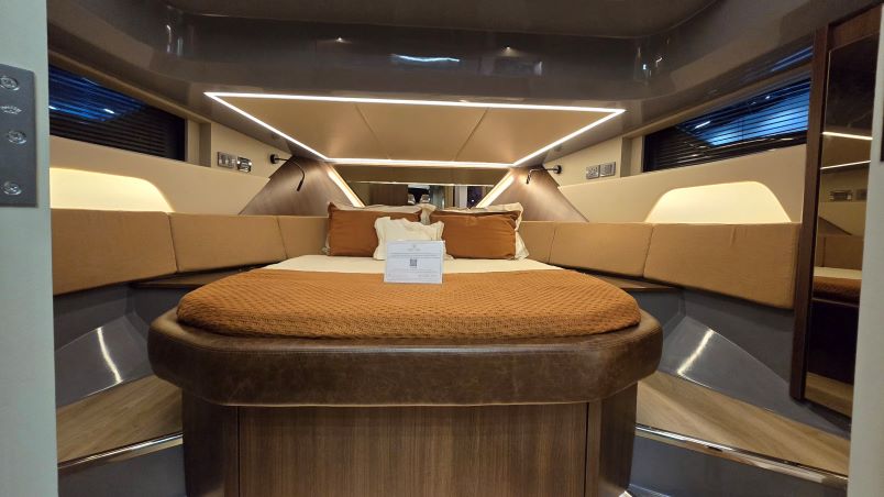 Neste lançamento do modelo de 44 pés, o foco da Triton Yachts foi apresentar uma proposta de ambiente sofisticado nas áreas de convivência, com o tom dos estofados no marrom claro, em harmonia com almofadas na mesma paleta, em cores mais claras e escuras, para realçar detalhes e para inspirar proprietários na hora de personalizar a decoração. “Trouxemos uma abordagem inovadora para os interiores. Decidimos substituir as pastilhas tradicionais dos banheiros por um novo material, e trabalhamos na iluminação dos degraus, um detalhe que antes não era comum nos barcos da marca. Nos quartos, exploramos tecidos e texturas diferentes, indo além do clássico corino, para dar um toque de exclusividade. Para a mostra da primeira unidade da 44 Flyer que marcou o lançamento do modelo, a ideia era ousar, com cores e materiais que normalmente não vemos em embarcações, mostrando que é possível ter uma lancha com personalidade e estilo único, como já percebemos em carros de luxo”, destaca Flavia.