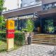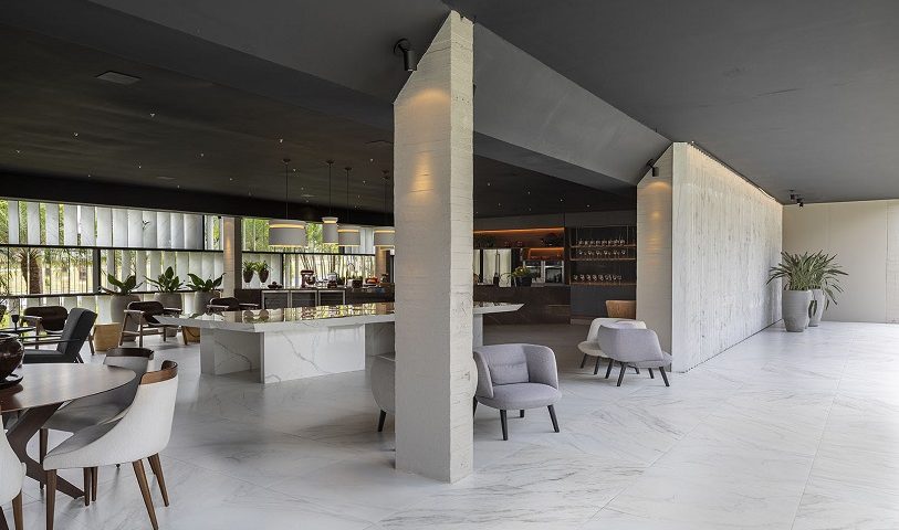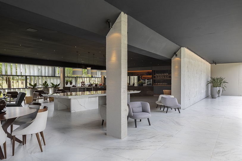 Neocarrara reveste todo o piso bem como os grandes painéis verticais filetados e os brises laterais, locais onde a superfície confere um ar de elegância e nobreza por imprimir a força do mármore branco em harmonia com veios assimétricos.