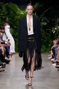 Equilibrando o rigor da cidade com o fascínio descontraído do resort, a passarela incluiu de tudo, desde sarongs e caftans a ternos de alfaiataria e casacos Chesterfield. Uma paleta de branco nítido, preto gráfico, limão tropical e papoula ousada é equilibrada por tons suaves de pérola, prata, duna e ouro. Movimento e luz são acentuados por franjas românticas, lantejoulas de alto brilho e tecidos líquidos, justapostos a silhuetas arquitetônicas e joias esculturais. O resultado é um guarda-roupa que celebra o corpo e funciona em todos os destinos do mundo.