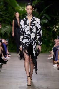 “Urban resort para mim é o melhor dos dois mundos, é o luxo e a elegância da vida urbana com o glamour descontraído que você encontra nos melhores resorts”, diz Michael Kors. “Esta coleção usa muitos elementos que você normalmente encontra nas férias — muito branco, muita nudez, caftans macios, sandálias despojadas — misturados com a alfaiataria nítida e o polimento que você precisa em um ambiente urbano.”