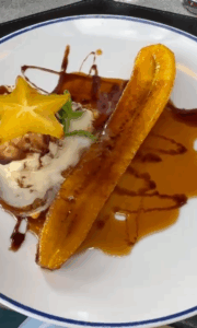 Dispor em um prato a Banana caramelizada junto com a calda, adicionar o sorvete de creme, acrescentar a calda por cima do sorvete e decorar com a hortelã e fruta escolhida.