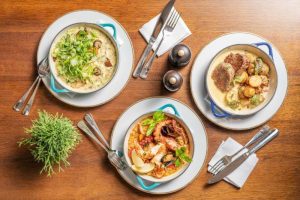 O brunch foi idealizado pelo chef Felipe Rodrigues, que dividiu o cardápio em quatro etapas: para começar, uma mesa de queijos brasileiros e charcuterie artesanal, da qual os clientes podem se servir à vontade; de entradas frias, a sequência é de steak tartare com crocante de parmesão, crudo de atum com azeitona siciliana e coalhada de ovelha, burrata com compota de morangos e avelãs tostadas e ovos beneditinos de salmão com molho hollandaise.