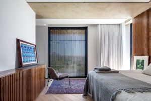 Para os apaixonados por natureza, nada como um quarto com vista privilegiada para uma bela área de preservação com lago, como esta área íntima que valoriza o paisagismo. Nesta suíte de arquitetura moderna com influência escandinava, o escritório Sum Architecture valoriza a integração do ambiente interno com o externo. O uso de materiais naturais cria um ambiente sóbrio e imponente, propício para uma experiência de conexão e contemplação para a o dia a dia da relação a dois.