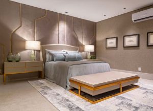 Esta suíte master projetada por Carolina Kist destaca o estilo contemporâneo e é ideal para jovens casais. A arquiteta explora diferentes materiais e cores, como a combinação de MDFs em tons mais escuros no mobiliário. O ambiente ganha design sofisticado com a marcenaria da Gava Ambientes que se soma aos detalhes em gold dos pendentes e em bronze do espelho.