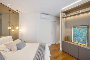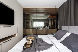 Esta área íntima leva assinatura de Alessandra Gandolfi e ganha sobriedade com o jogo de contraste da paleta cromática, que passeia pelas tonalidades de cinza – desde o mais escuro do painel ripado ao tom argila do mobiliário – até o preto que aparece novamente na serralheria e no projeto luminotécnico. A madeira e os pontos de cor presentes na mesa de cabeceira e na cadeira do espaço também criam um contraponto, elevando o conceito moderno da área íntima.