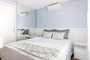 Pontos estratégicos de cor e valorização da iluminação natural são fundamentais para quem deseja harmonia na convivência a dois. Assinada pelo escritório Meister & Polese, esta suíte traz uma paleta de tons claros para ampliar o espaço. A composição clean também favorece a distribuição uniforme da incidência de luz natural no local. Em meio às nuances de branco e cinza, de maneira sutil, o azul dá vida ao ambiente, proporcionando relaxamento e harmonia para o casal.