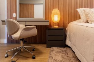Quarto com décor natural – painel ripado de madeira e abajur feito com fibras em projeto de Luciana Ballio/ Foto de Emerson Rodrigues