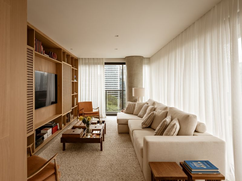 Este apartamento na Vila Olímpia, voltado para a paisagem da Avenida Brigadeiro Faria Lima, foi pensado para um casal jovem que buscava um lugar luminoso, funcional e com materiais que transmitissem calma. A madeira tauari aparece como fio condutor do projeto e ajuda a criar essa atmosfera acolhedora que se percebe logo na entrada.