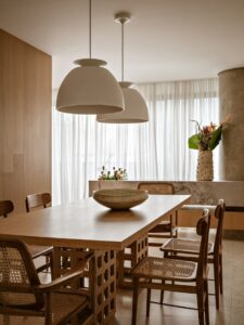 O projeto ganha força também nas escolhas afetivas do décor. A Poltrona Dinamarquesa de Jorge Zalszupin, garimpada em antiquário, convive com a delicadeza da Mesa de Centro Tapi, de Maria Candida Machado, enquanto as mesas laterais Mini Recortes, de Isabelle de Mari, aparecem como pequenos respiros escultóricos ao lado do sofá. Na iluminação, os pendentes Bossa, de Fernando Prado, adicionam um brilho suave ao ambiente integrado. Já as cadeiras Oscar e Lucio, ambas de Sergio Rodrigues e também encontradas em antiquário, reforçam o protagonismo do design brasileiro na composição.