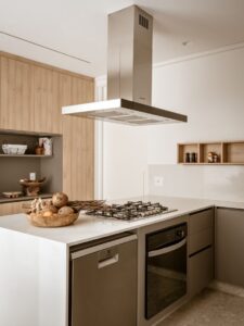 Já a cozinha foi pensada para funcionar como extensão direta da sala. A marcenaria segue o mesmo tom da área social, garantindo continuidade visual, enquanto a bancada e os armários foram projetados para deixar o ambiente sempre organizado, mesmo no dia a dia. A escolha por superfícies limpas e poucos materiais reforça a sensação de unidade e permite que o espaço se mantenha discreto quando visto do living, uma solução importante para a proposta de integração total.