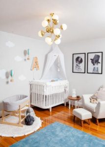 Linda e Cris destacam mais recursos que quebram a frieza dos tons frios em ambientes infantis: “Em um projeto apostamos na sutileza da pintura na parede. Inserimos um balão e letras com o nome da criança iluminado em amarelo. Escolhemos um lustre Sputnik Ana Neute para dar um toque de design assinado. A peça trouxe personalidade e um toque do design brasileiro, além dele ser um lustre bem lúdico”.