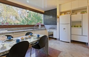 E por falar em bancada, os modelos atuais de fogão à lenha estão tão evoluídos e diversificados que é totalmente possível ter um dentro de um apartamento. Existem alguns tipos que não soltam fumaça, por exemplo. O espaço para lenha é menor e as panelas ficam em cima de uma chapa. “O fogo não tem contato com a panela, impedindo que ela escureça, assim como as paredes por conta da fumaça. A lenha fica protegida e o fogo não passa pelas trempes do fogão. Esses fogões podem ser usados em apartamentos e, também, ser revestidos com materiais mais rústicos ou sofisticados, de acordo com a intenção do morador”, revela a designer.