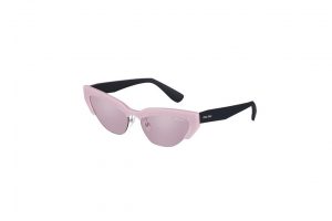 Já a Miu Miu aposta no clássico modelo gatinho. A armação frontal apresenta linhas decididas e ângulos marcados, as espessuras são importantes, em contraste com as lentes livres na parte inferior. A paleta de cores inclui branco, rosa, azul e preto, além dos detalhes em pedraria ou glitter.