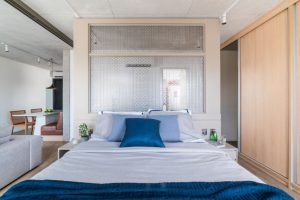 A profissional alerta sobre a importância de observar a abertura das portas dos armários. Para não prejudicar a circulação no quarto, o morador pode optar pela marcenaria com porta de correr – de preferência, aquelas que compreendem o vão completo entre piso e teto para melhor aproveitamento do maleiro do armário. Por fim, o bom (e sempre atual) espelho segue como um queridinho no intuito de fazer o quarto mais espaçoso. “Espelhos são bem vindos nos quartos, mas sempre evito posicioná-los de modo que quem se deita à cama veja seu reflexo. Isso evita aquela sensação de ter alguém te observando e levar sustos à noite.