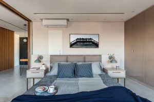 Segundo a arquiteta Júlia Guadix, à frente do Studio Guadix, o formato do ambiente e a relação daquilo que é essencial em um dormitório guiam o projeto. Em sua lista, junto com a cama, que protagoniza o ambiente, são sempre bem-vindas a inclusão de duas mesinhas de apoio – que podem (ou não) conter gavetas, a depender do perfil de organização do morador. “As peças são fundamentais, haja vista que o dia a dia pede um local para dispor, ao lado da cama, um livro, iluminação e um apoio para o celular”, explica. Além disso, é imprescindível considerar um espaço adequado para o armazenamento de roupas e outros itens pessoais do morador.