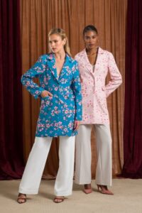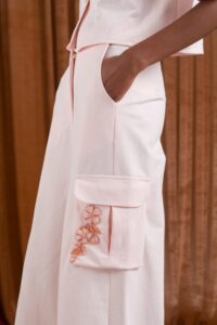 Nas versões em alfaiataria colorida, o Scrub Caterine é apresentado nas cores rosa e marrom, com blusa estilo camisa e bordado na gola, além de calça cargo com cós liso, fechamento em zíper e bordado sobre o bolso esquerdo. Já o Macacão Stella, também nas mesmas tonalidades, é sem mangas e conta com gola esporte, zíper na calça e faixa na cintura para ajuste. A coleção se completa com o Broche Flower feito à mão, que simboliza o toque final de brilho e delicadeza.