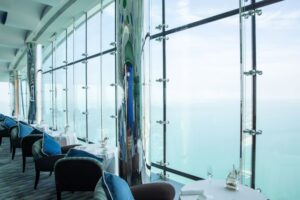 Para uma experiência nas alturas, o At.mosphere, restaurante mais alto do mundo, localizado no 122º andar do Burj Khalifa, convida os casais a brindarem com vista para os icônicos arranha-céus de Dubai.