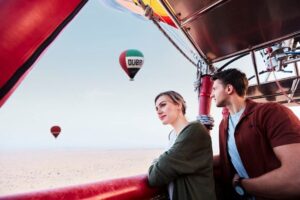Casais mais aventureiros podem optar por um voo de balão ao amanhecer sobre o deserto árabe. Empresas como Hero Balloon Flights Dubai oferecem pacotes que incluem traslados, café da manhã e até sessões de fotos no amanhecer dourado do deserto.
