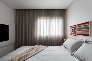 Com a reforma a suíte master foi ampliada proporcionando um banheiro mais confortável e um espaçoso closet. Seguindo as mesmas características de decoração usada na sala, o quarto mantém as cores neutras, madeira, fibras naturais e artesanato. O destaque fica por conta de dois quadra de bordados com desenhos geométricos da Tapeto Atelier em tons terrosos sobre a cabeceira em madeira MDF de ponta a ponta com mesas laterais elevadas e arandelas pontuais.