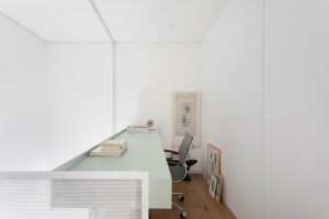 Acessando o piso superior, onde ocorreram mudanças significativas, o Samba Estúdio criou um home office no mezanino, que pode ser avistado logo na entrada do pavimento inferior ficando de frente para a porta de entrada do apartamento.