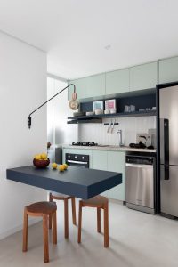 No piso inferior não houve muita intervenção, foram mínimas na estrutura, aproveitando ao máximo a iluminação e a ventilação natural, mantendo a integração da área social. Com tons neutros, branco e bege, a combinação das cores menta e azul petróleo usadas nos revestimentos dos armários da cozinha e bancada de refeições confere o charme clean e descontraído tão almejado.