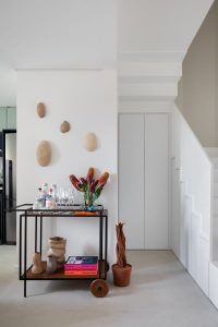 Por se tratar de um duplex, a escada é um elemento marcante nesta obra, e foi projetada com chapa metálica dobrada e corrimão em chapa perfurada na cor branca seguindo a paleta neutra. No espaço inferior da escada foi instalado um armário funcional para armazenamento.