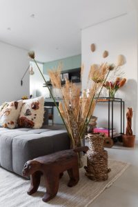 Localizado em Moema, bairro tradicional e agitado da capital paulista, o apartamento duplex com 90 m² foi reformado pela arquiteta Rafaela Caminhola, do Samba Estúdio, que criou de forma equilibrada ambientes com características contemporâneas, muito artesanato em tons terrosos e urban jungle.