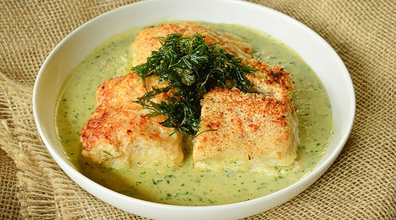 Bacalhau cozido em molho à base de leite, salsinha, cebola e queijo, finalizado com pangrattato e queijo Grana Padano gratinado